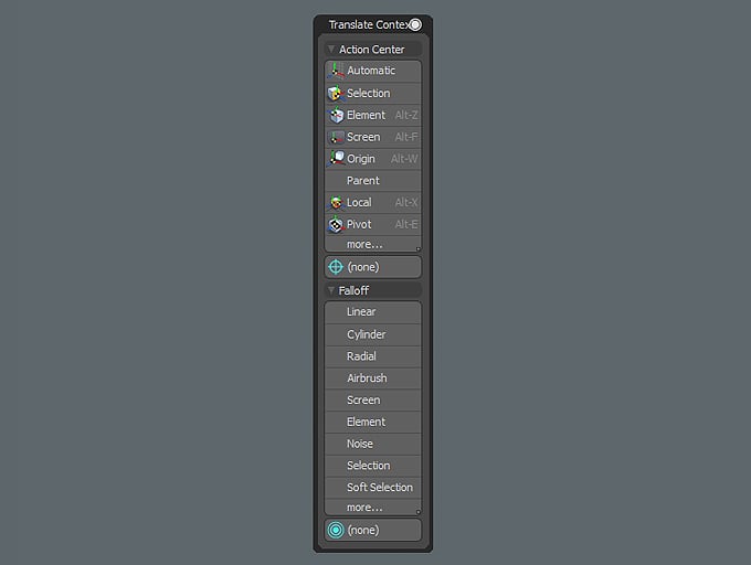 Custom contextual menu dedicated to Action Center and Falloffs. Mapped to RMB by default and only active with Move, Rotate and Scale tools, in a way that doesn't break or block your own keymap.